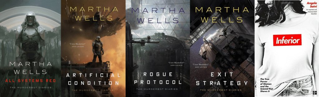 The Murderbot Diaries # 1-4: All Systems Red, Artificial Condition, Rogue Protocol, and Exit Strategy – Martha Wells. I LOVE MURDERBOT!!! After discovering the first in this series, I devoured all four of these short novellas back to back. Super fun sci-fi about an organic-android construct who becomes self-aware and breaks free from his punishingly restrictive governor module and starts to think (and feel?) for himself. At first he needs to escape punishment by following orders and blending in on missions with other SecUnits, who have no emotions, no free will, and no thoughts of their own. Eventually, shenanigans ensue and he is forced to find a way to exist without being told what to do. He begins to consider what (who?) he truly is, and what his place in the universe might be. There really is a lot of deep examination of what it means to be a human in these stories. But they rip along at an incredible pace! Non-stop sci-fi action, very shooty, very fun, and Murderbot himself is a fantastic and ultimately lovable narrator. I love Murderbot!